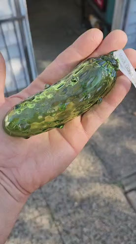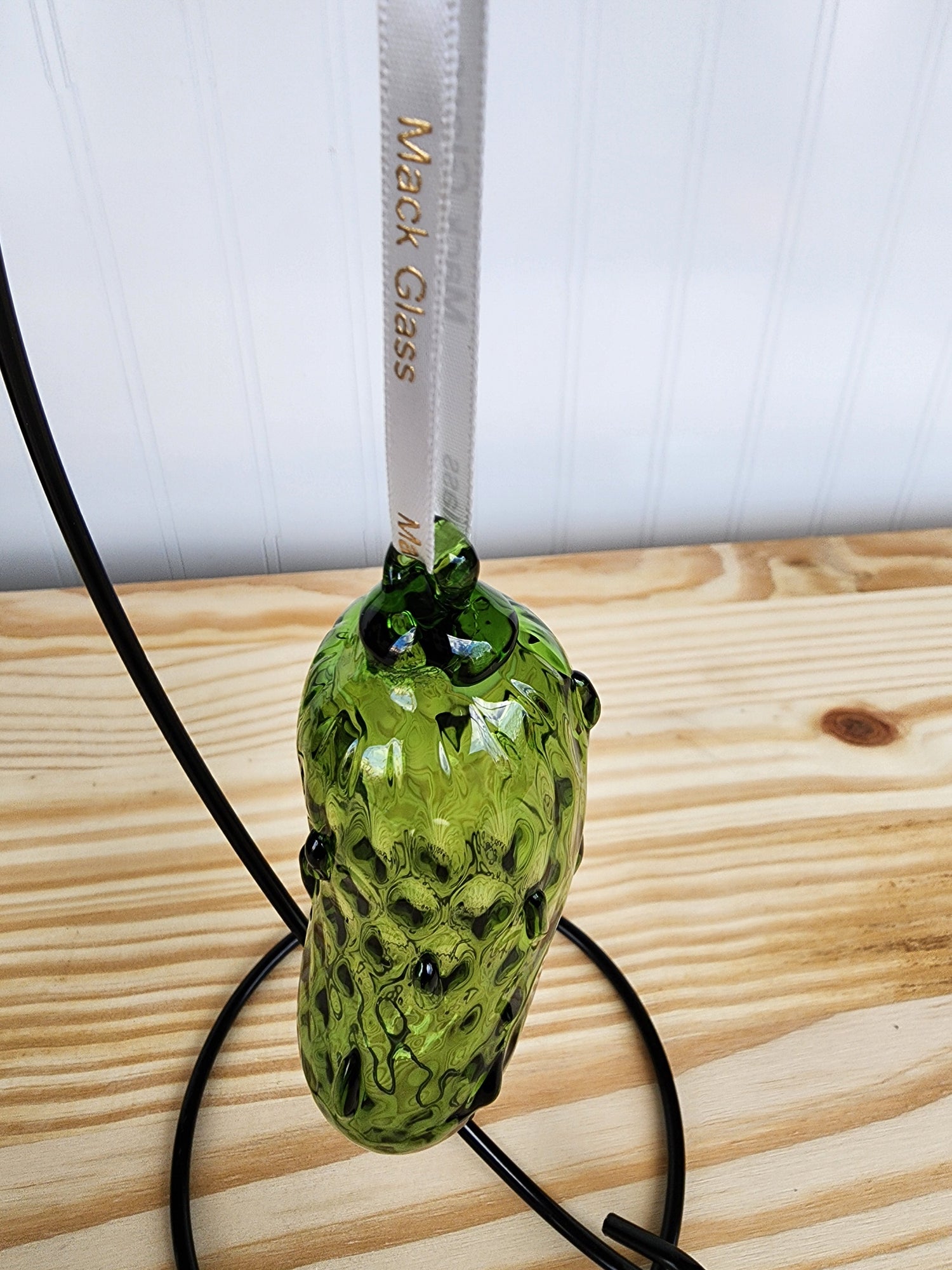 After scouring the internet I can say with confidence this is hands down the best blown-glass pickle ornament on the market today. Each one is individually sculpted and hand-blown to perfect proportions and texture. Each one has a white ribbon with raised gold print 'Mack Glass'. I originally made one pickle by custom request, fairly reluctantly to be honest. Then I made another just for fun. Then I made a couple dozen for our 2022 Christmas event. They turned out to be one of the most popular items.